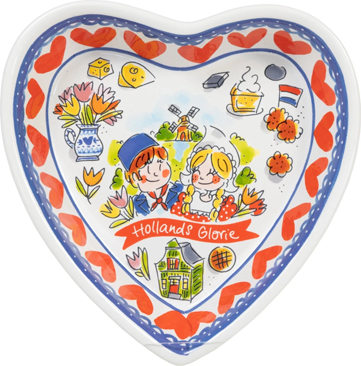 We love Holland! De nieuwe Hollands Glorie lijn van Blond Amsterdam is vormgegeven in frisse rood/wit/blauwe tinten en voorzien van typisch Hollandse illustraties. Deze hartvormige schaal is geillustreerd met een Hollands stelletje in Hollands landschap.