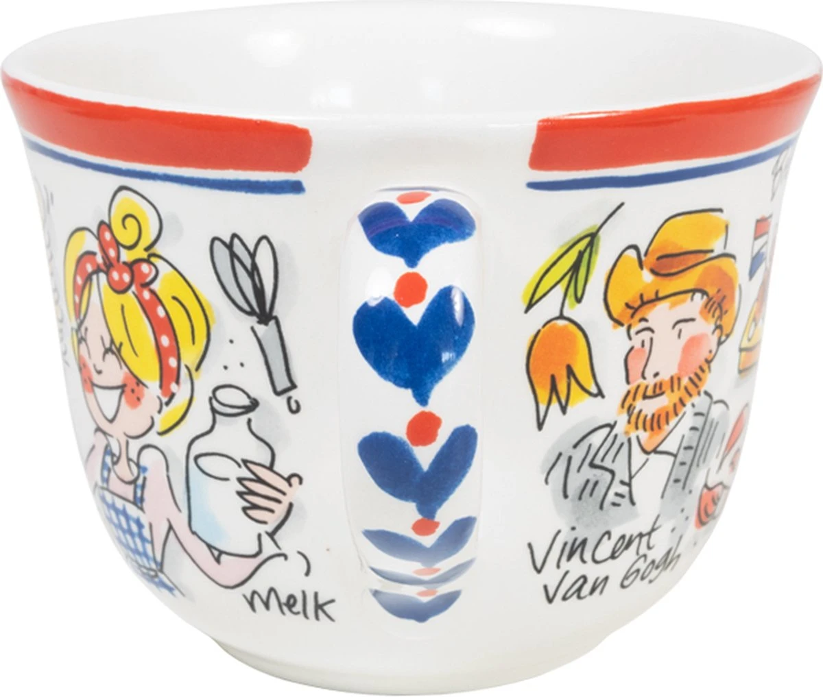 We love Holland! De nieuwe Hollands Glorie lijn van Blond Amsterdam is vormgegeven in frisse rood/wit/blauwe tinten en voorzien van typisch Hollandse illustraties.Op deze soepkom staan o.a. illustraties van Vincent van Gogh, pannenkoeken en klompen.