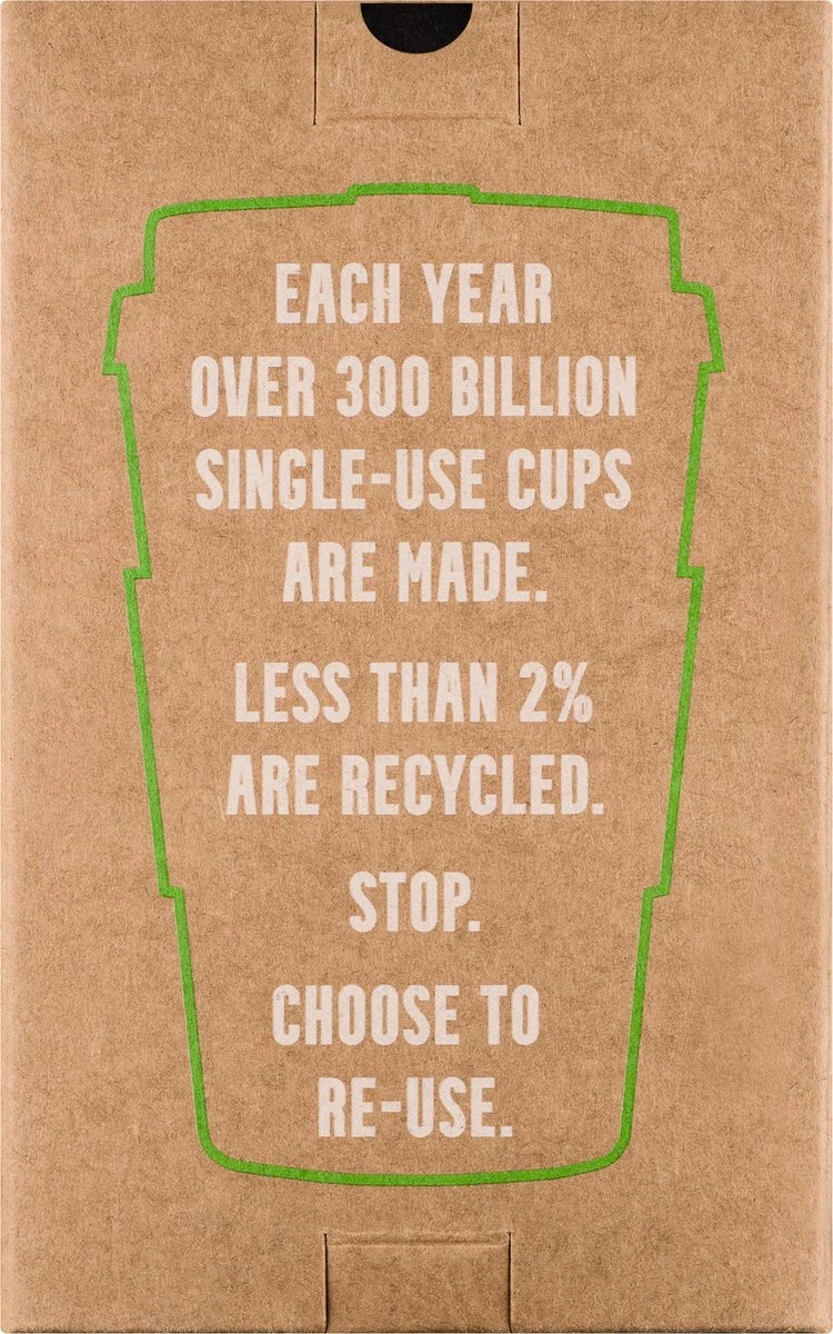Deze iconische beker is gemaakt van natuurlijk hardgevormd polymelkzuur, een biopolymeer gemaakt van 100% hernieuwbare, plantaardige materialen zoals suikerbieten, maïs en aardappelzetmeel. Verder is de Ecoffee Cup melaminevrij en vrij van BPA, BPS en ftalaten.