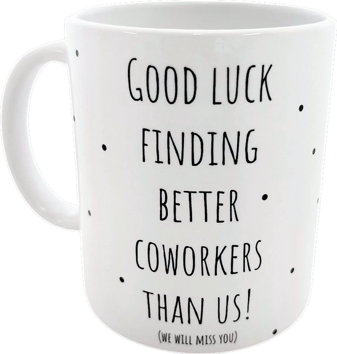 Gaat je favoriete collega jullie verlaten? En ben je op zoek naar een leuk afscheidscadeau voor diegene? Dan hebben wij wat leuks voor jou. Wij bieden een afscheidsmok aan met de tekst: ”Good luck finding better coworkers than us! (we will miss you)”. De keramische mok heeft een inhoud van 300 ml en is dus groot genoeg voor een grote kop koffie, thee of melk.